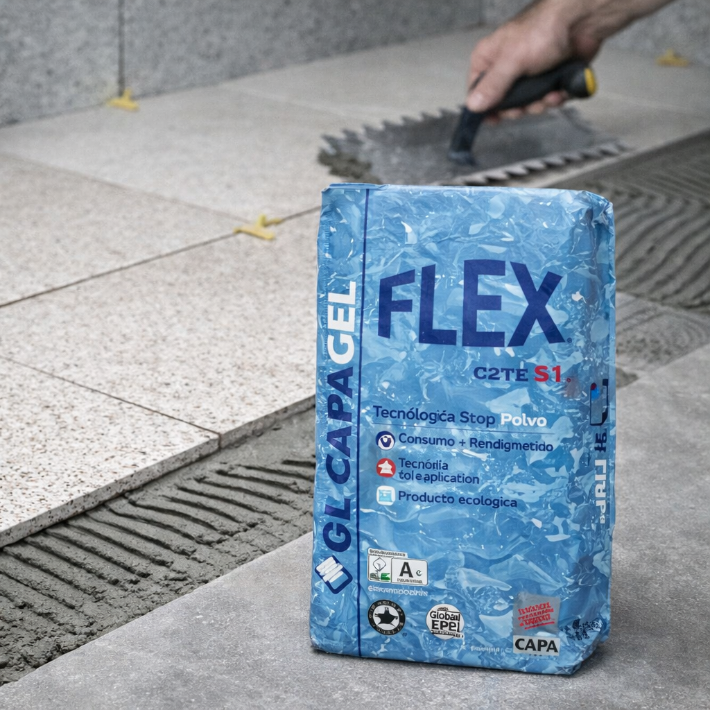 GL Capagel Flex es un adhesivo gel con prestaciones de adhesivo cementoso clasificado según UNE EN 12004 como C2TE S1. Su composición, basada en geopolímeros de última generación, le da una excelente trabajabilidad y una textura tipo gel. Además, incorpora fibras de nueva tecnología que aportan elevada tixotropía y un tiempo abierto extendido, favoreciendo un agarre total gracias a su buena reología. También incorpora tecnología “stop polvo”, reduciendo en un 95% la emisión de polvo en suspensión, y su formulación permite obtener un mayor rendimiento, consumiendo menos kg por m² de colocación.