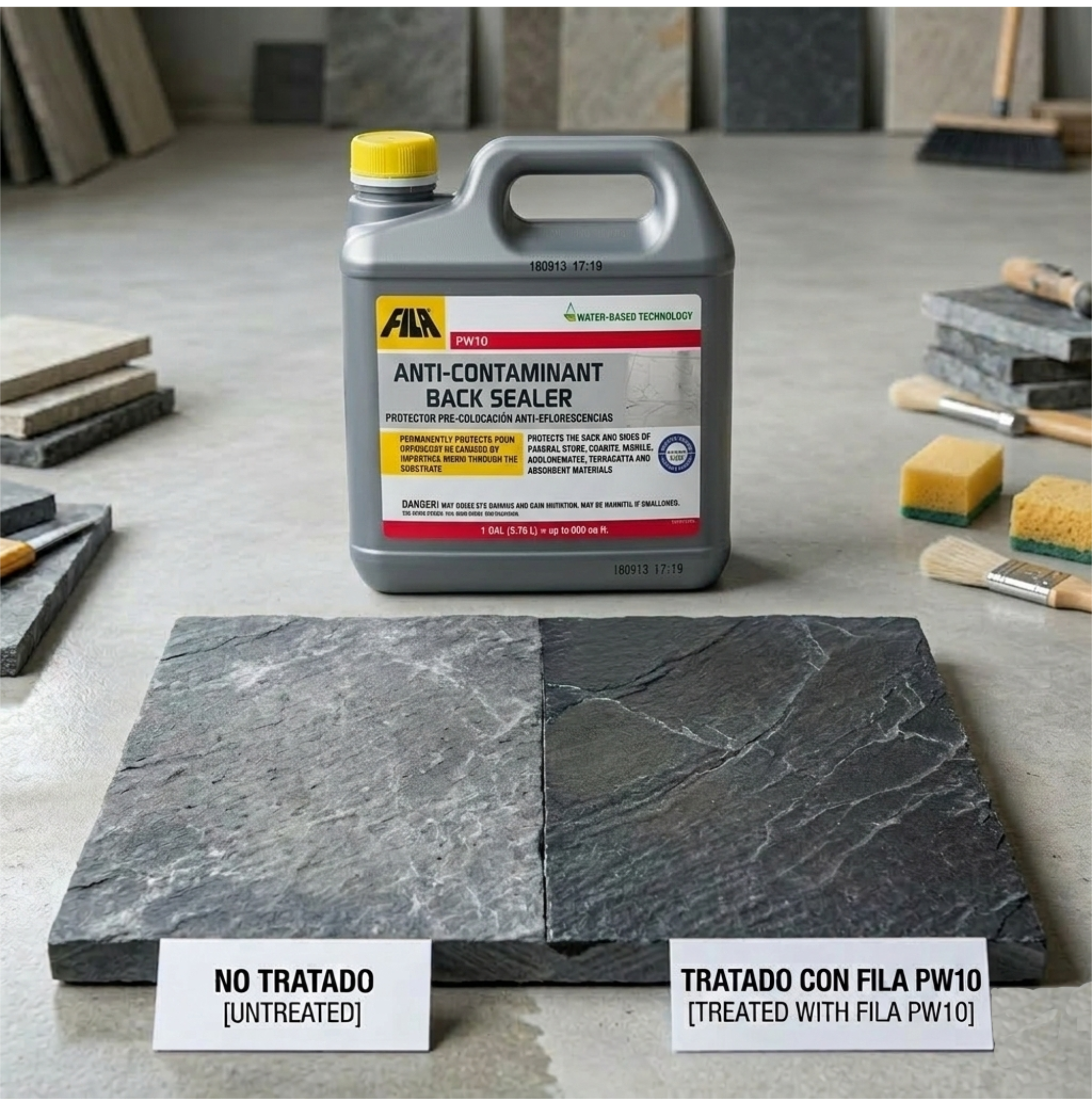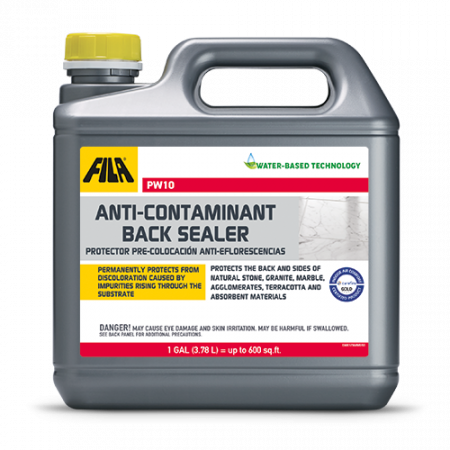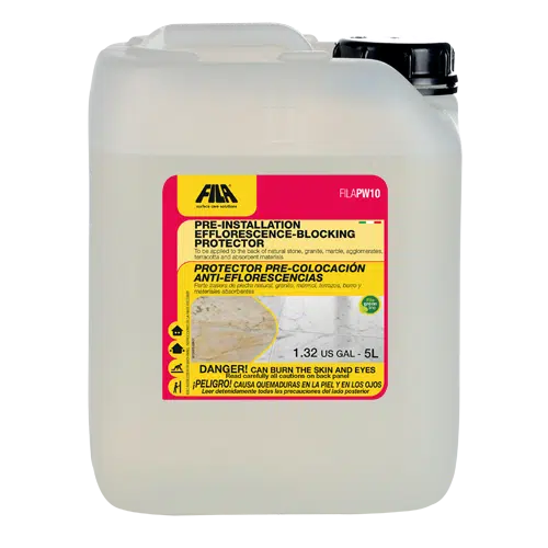 El PW10 es un impermeabilizante de base acuosa diseñado para proteger piedras naturales, granitos, mármoles y materiales absorbentes antes de ser colocados. Evita el ascenso de sales, óxidos y otras impurezas que causan manchas oscuras o eflorescencias blanquecinas en la cara vista de la piedra.