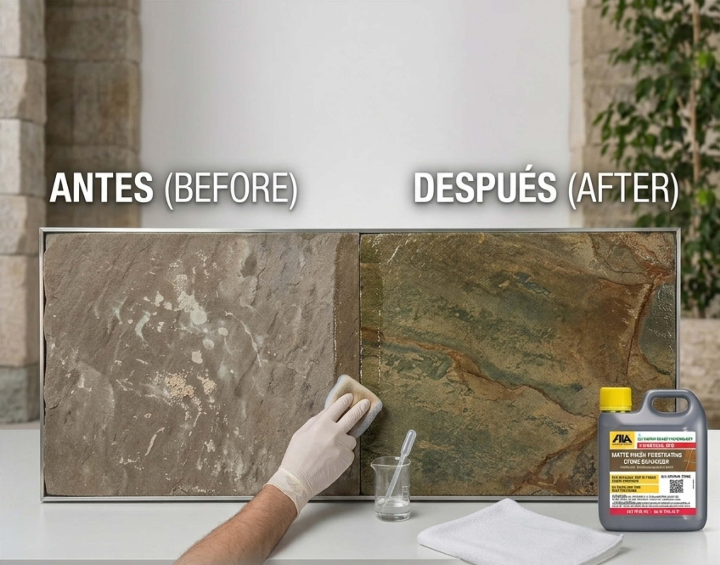 Eliminación de excesos: Tras unos 10 minutos, retira cualquier exceso de producto que la piedra no haya absorbido usando un paño de microfibra.