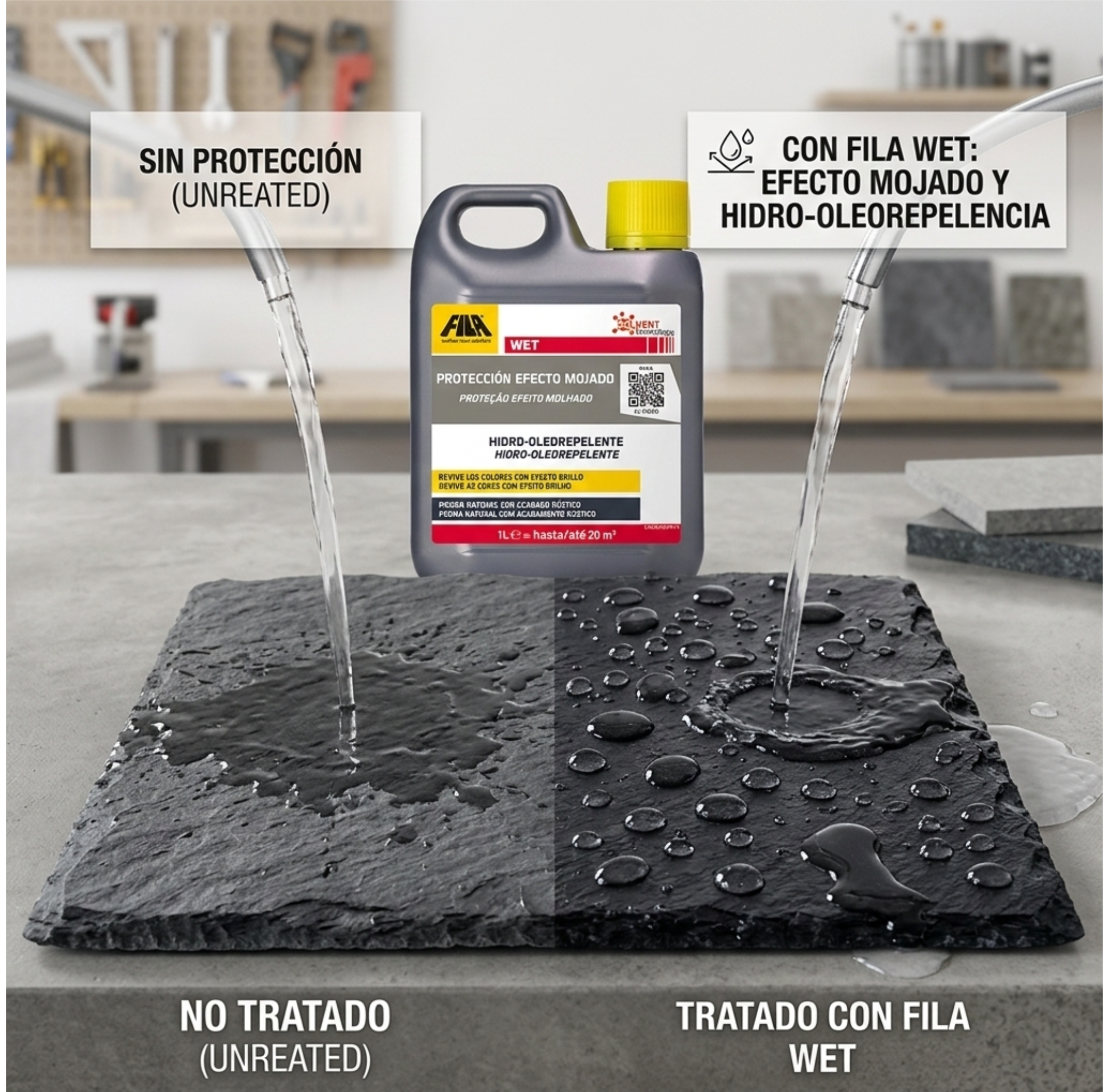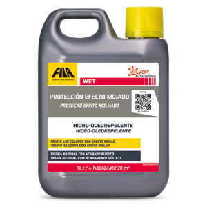El FILA WET es un protector antimanchas de base solvente que otorga un acabado con brillo intenso (efecto mojado) a las superficies de piedra natural bruta. Es la solución ideal para realzar la belleza de materiales rústicos mientras se crea una barrera protectora de larga duración.
