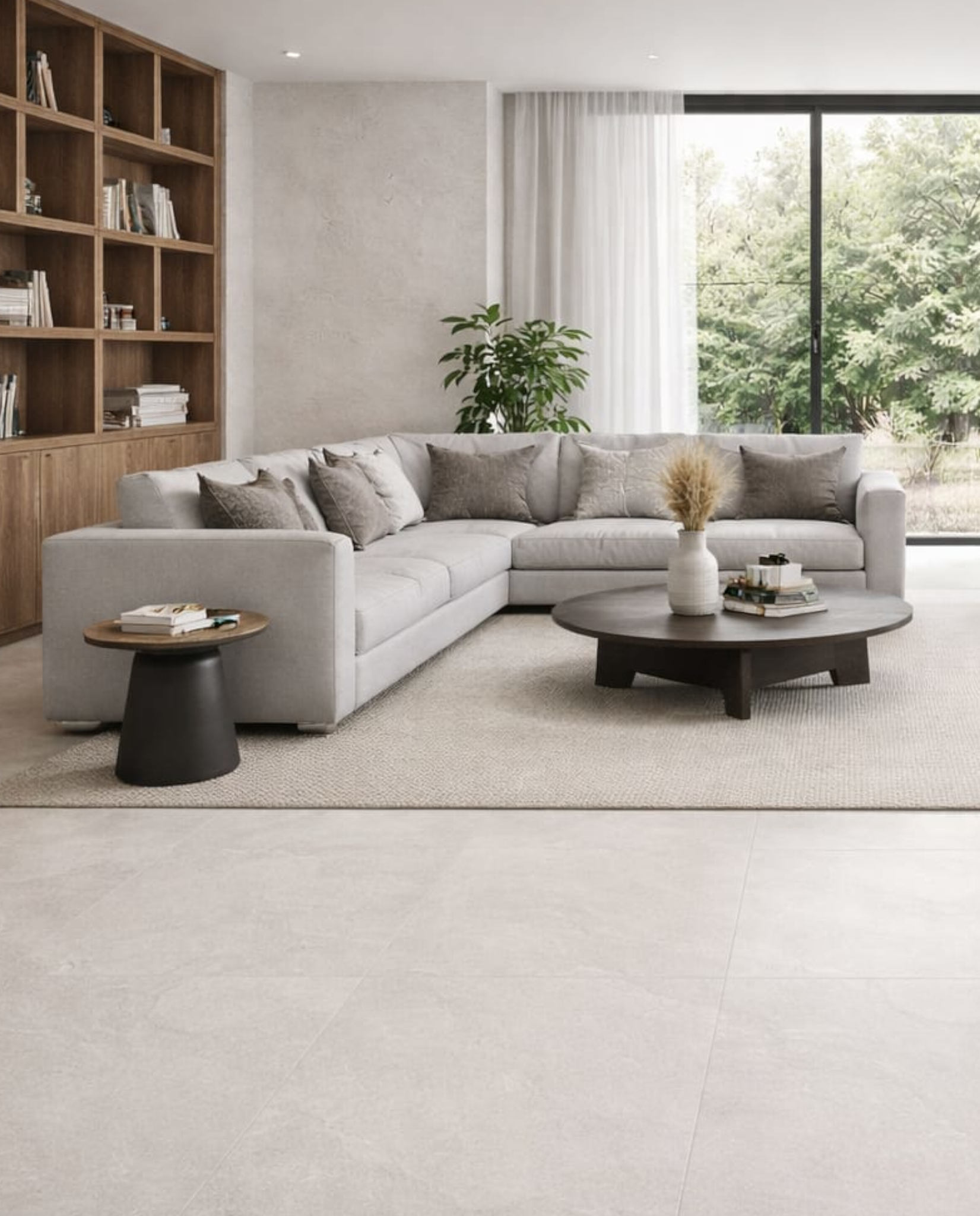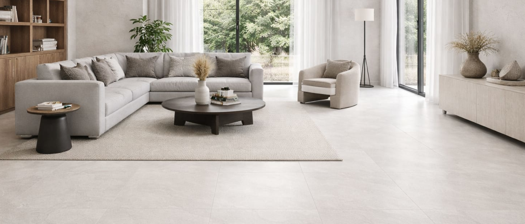 Porcelánico efecto cemento en tono blanco con estética urbana y actual.