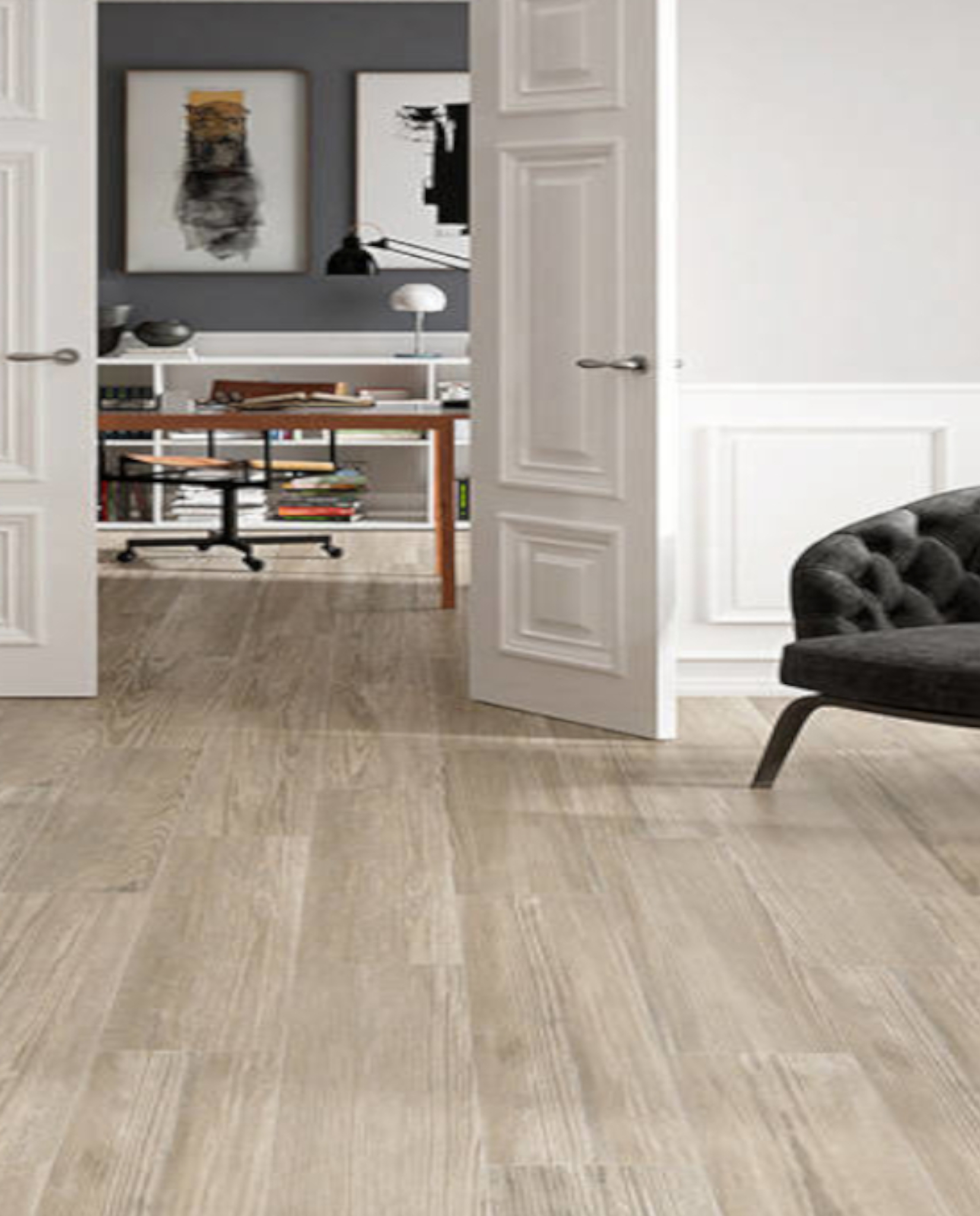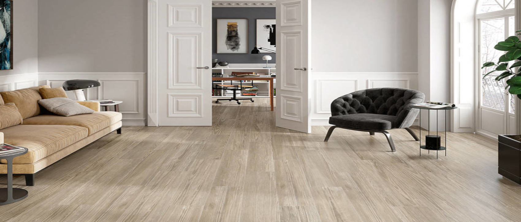 Porcelánico efecto madera en tono natural con vetas equilibradas y aspecto orgánico.