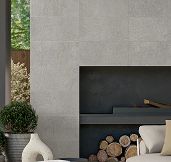 Porcelanato de tonalidad clara dentro del lenguaje pétreo, con una lectura más luminosa.