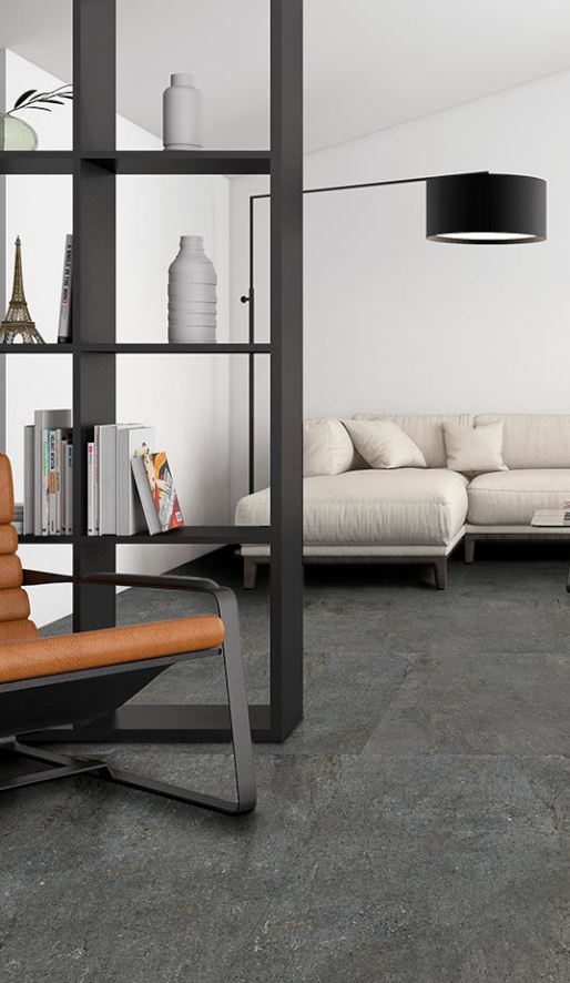 Porcelánico efecto pizarra en tono oscuro con textura marcada y natural.