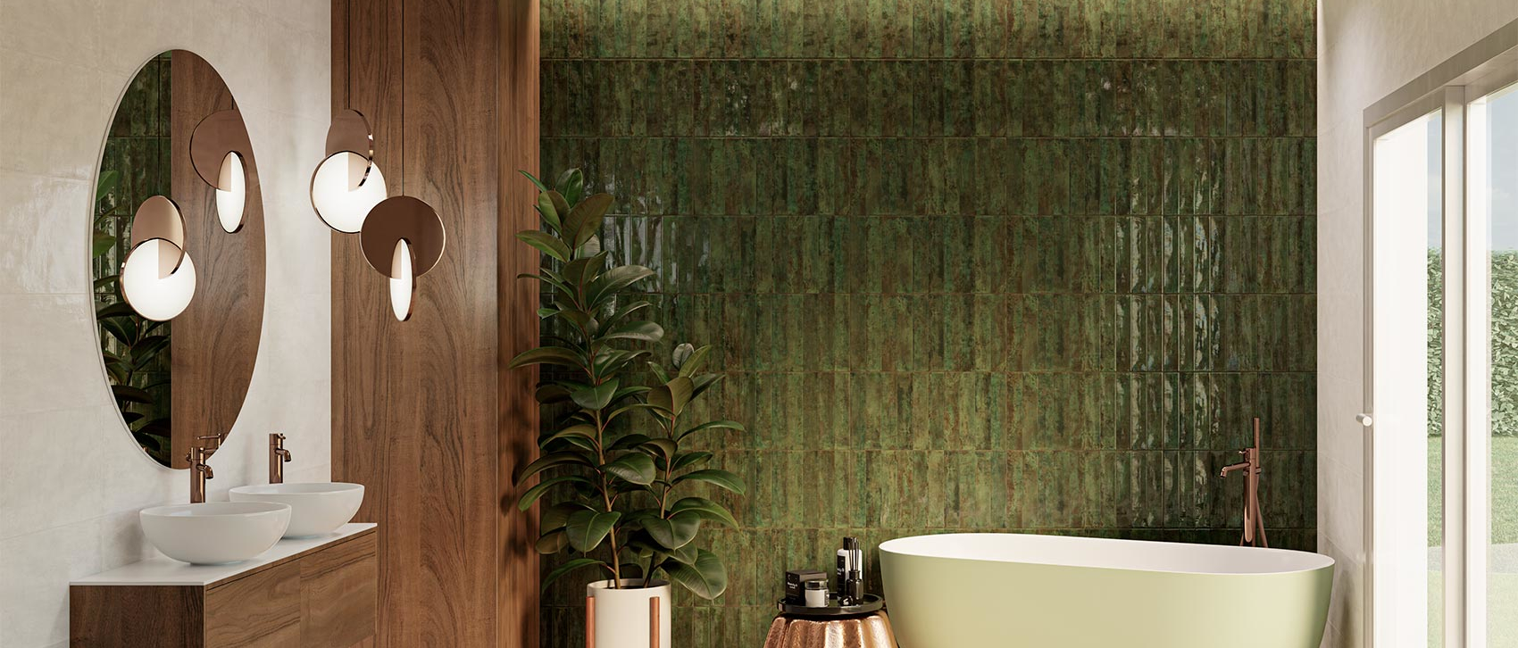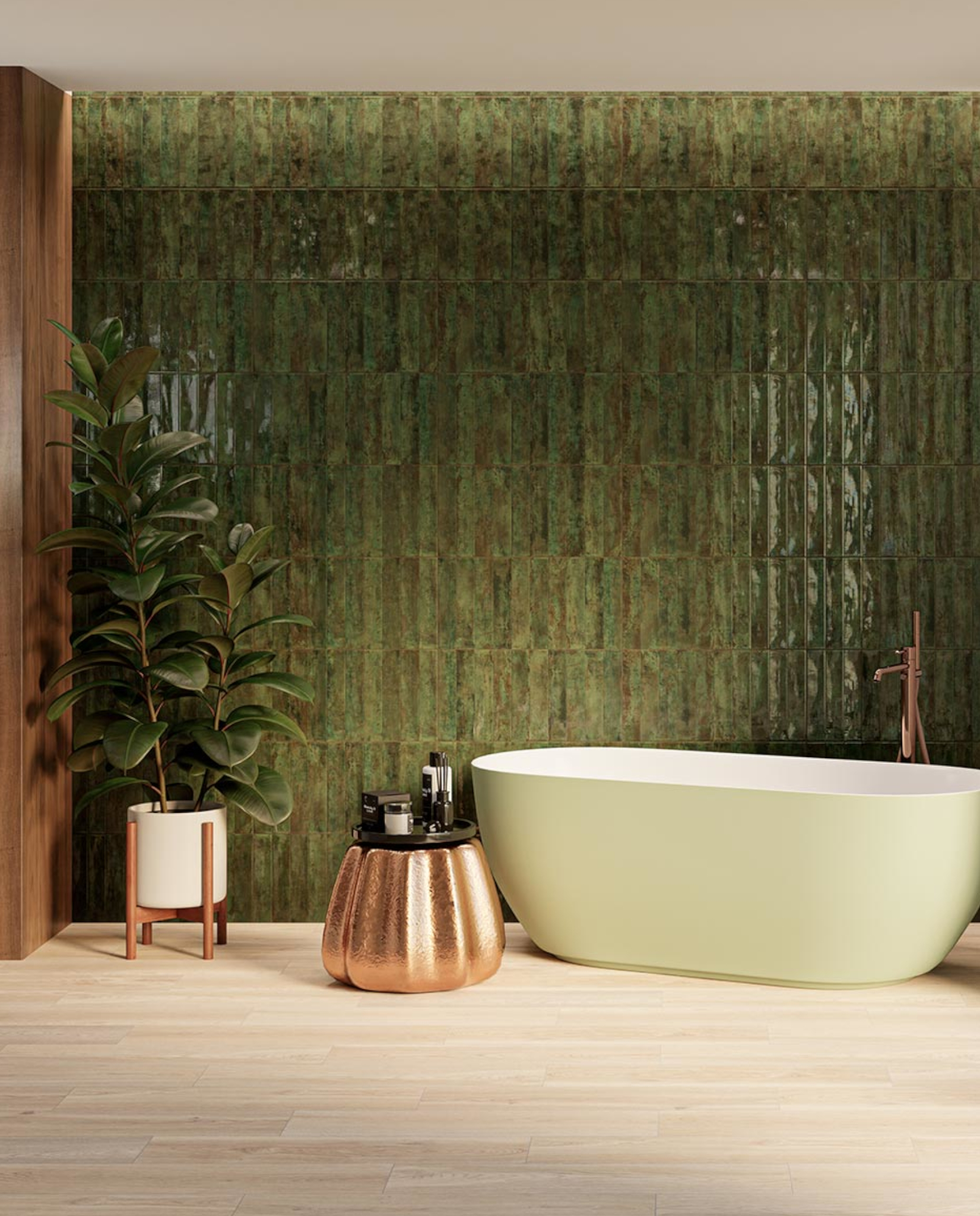 Porcerlanato verde acabado brillante con fuerte presencia cromática y efecto artesanal.