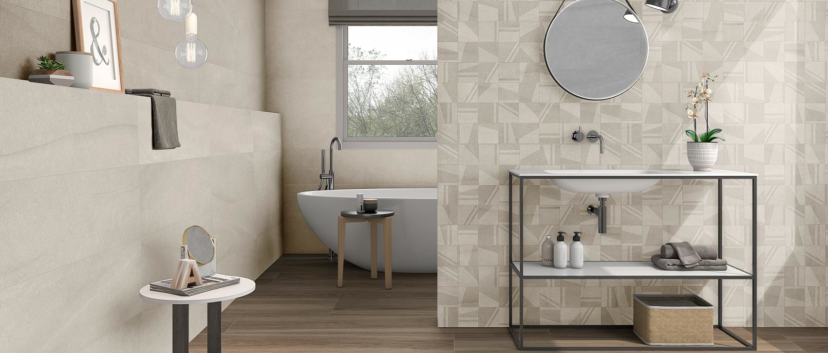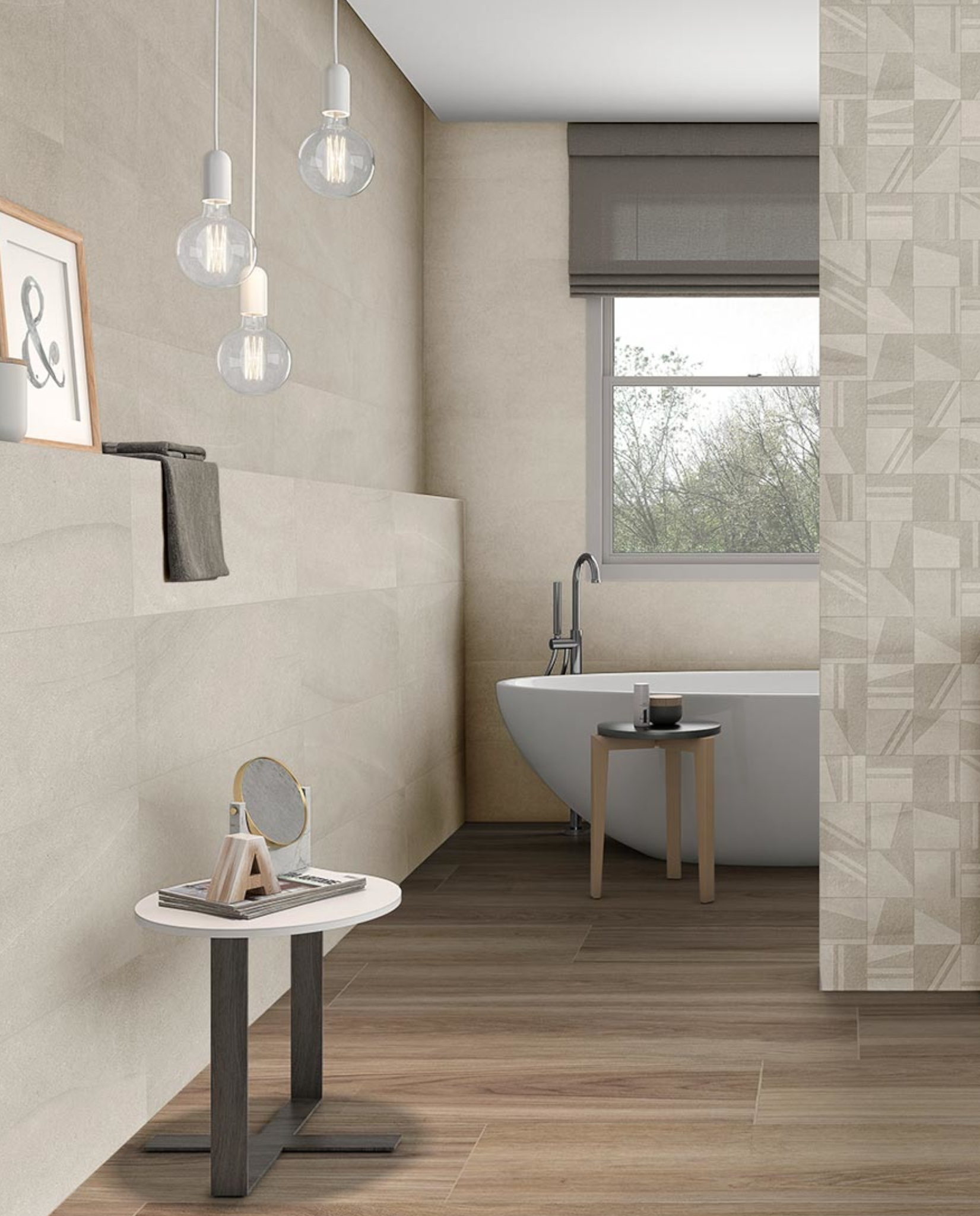Porcelánico en tono arena con relieve decorativo y matiz cálido.