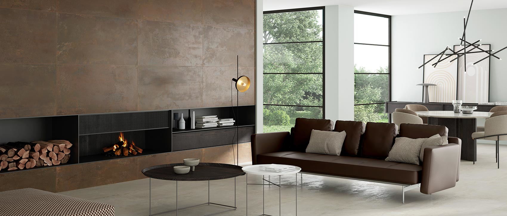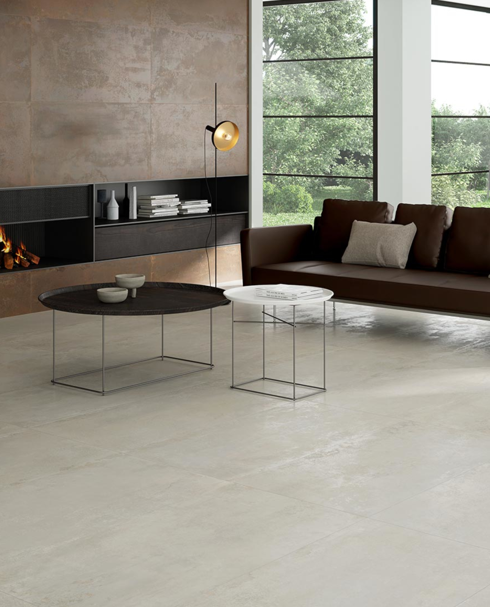 Porcelanato tipo metal cálido con matices cobrizos y estética industrial refinada.