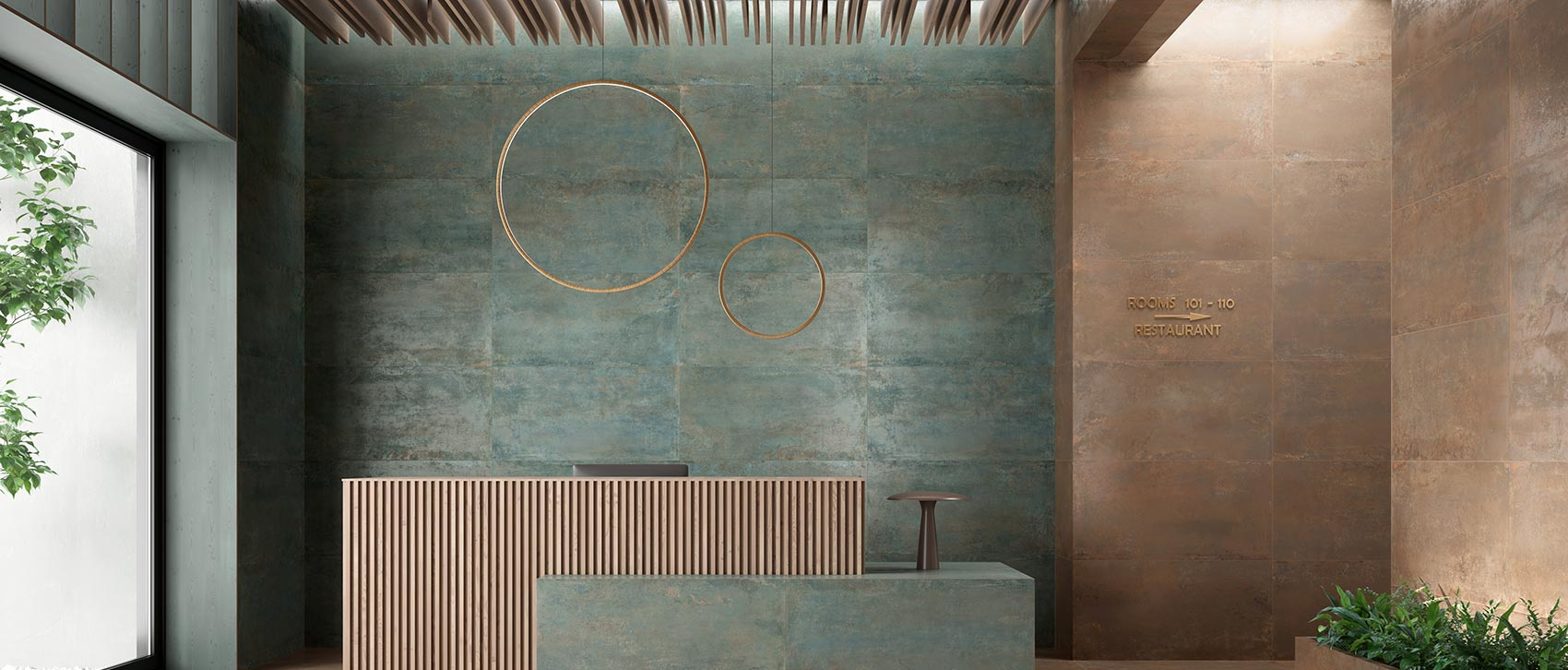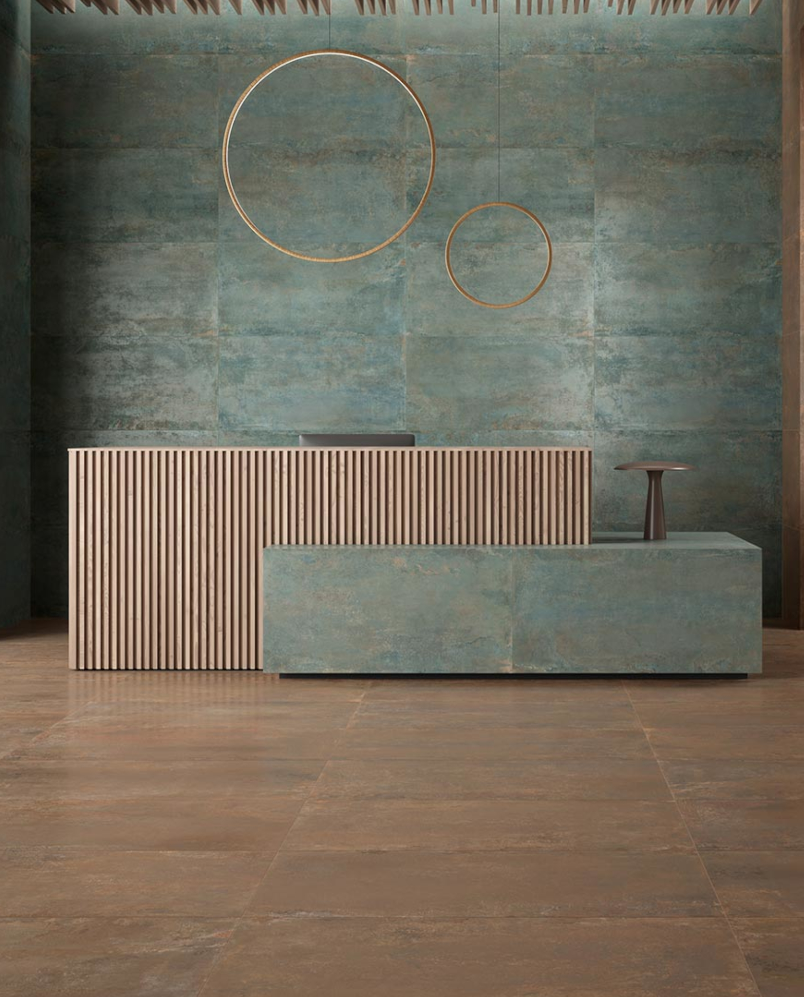 Porcelanato de acabado metálico con profundidad y carácter industrial.